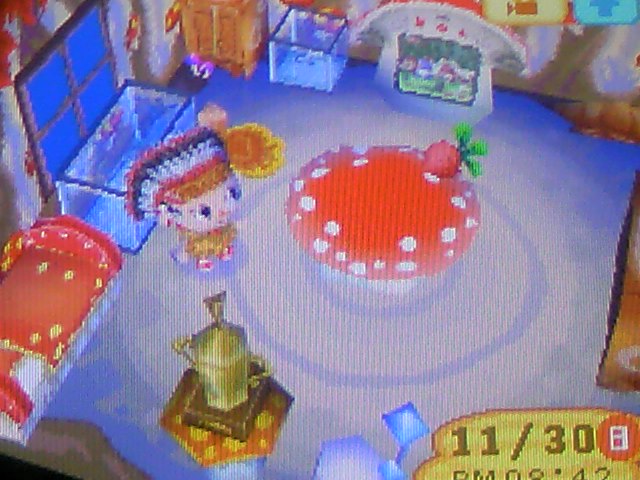 家具はきのこのベッド、、きのこの箪笥、キノコのクロゼット、マッシュルームチェア、猿の腰掛、キノコのテーブル、キノコのサイドテーブル、冬虫ランプ、キノコテレビ、釣りのトロフィー、その辺で釣った魚各種。